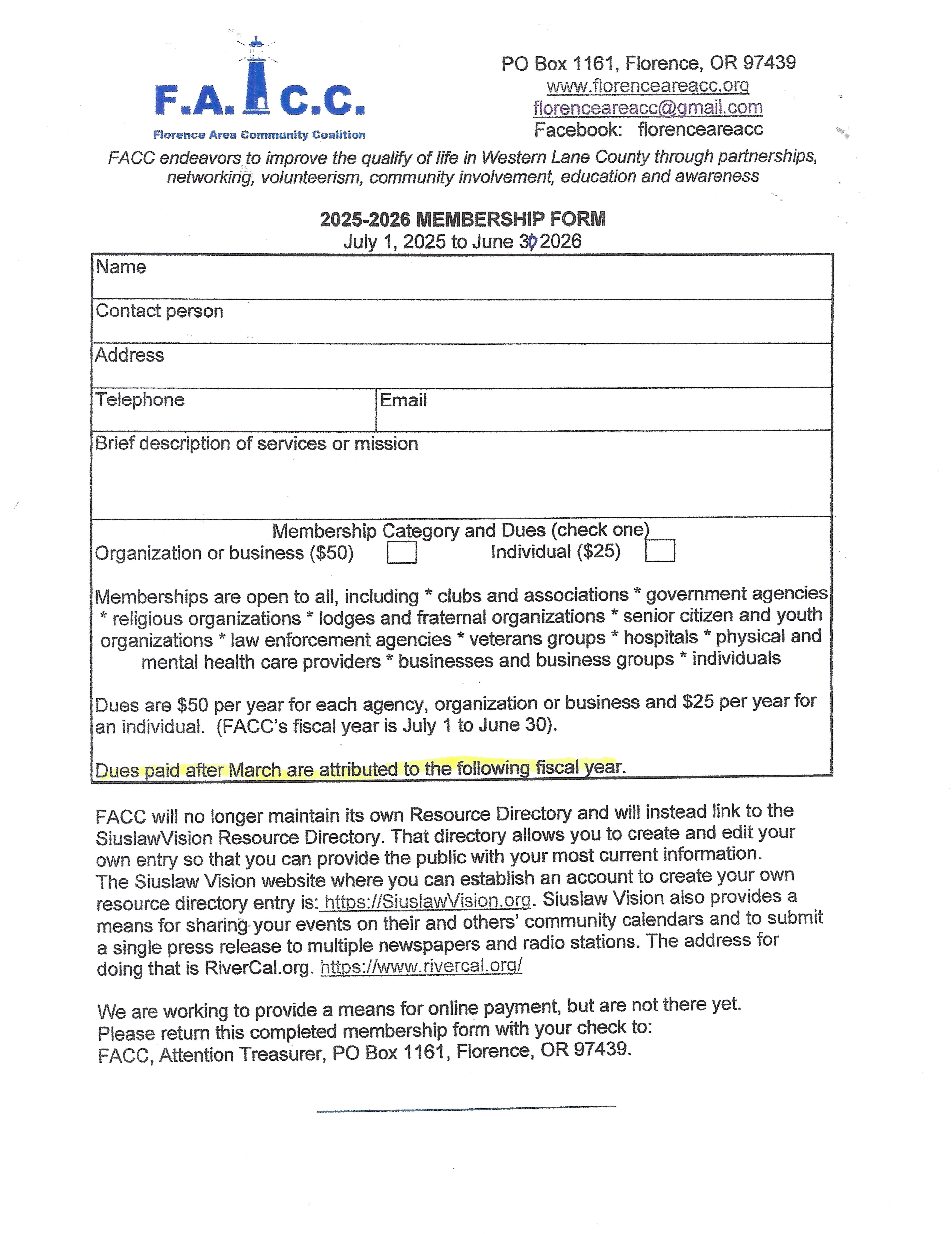 Download a printable PDF application and mail it to FACC, Attention Treasurer, PO Box 1161, Florence 97439.